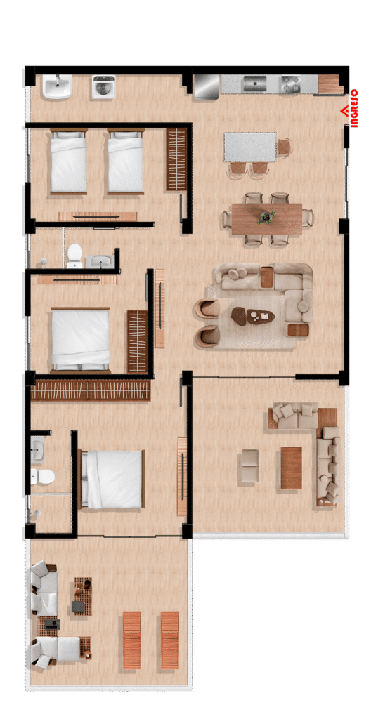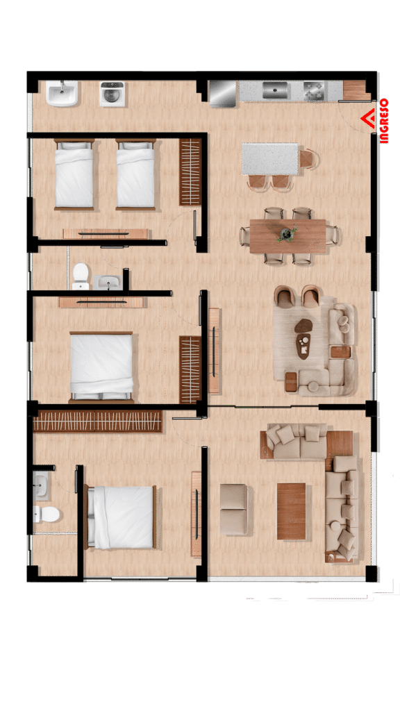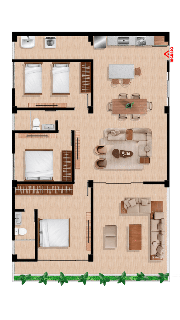 Los exclusivos departamentos de Villa Rose ofrecen un diseño elegante y funcional. Cada unidad cuenta con un dormitorio principal con baño privado y walk-in closet, además de habitaciones adicionales con baño compartido. Disfruta de una terraza privada para relajarte y vistas al mar, junto con una amplia sala-comedor y área de lavandería. Perfectos para un estilo de vida confortable frente a la playa.